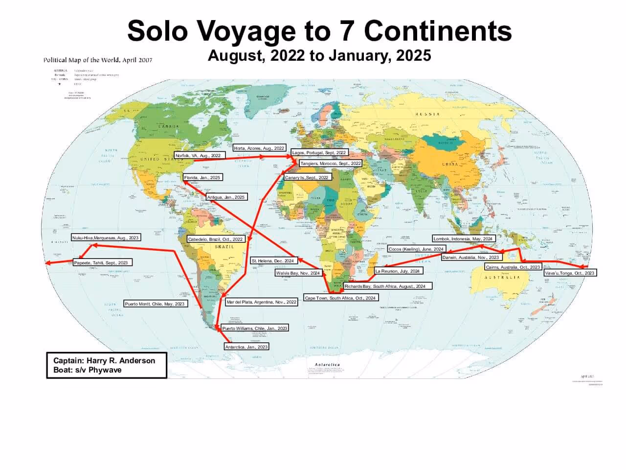 After his first Atlantic crossing, he stopped off in Portugal, in Lagos, to discover the wines and landscapes of the Algarve. In Africa, he stopped off in Morocco, then South Africa and Namibia on his return journey. Harry sailed along South Africa's famous Wild Coast, carried by the powerful Agulhas Current. In South America, he stopped off in Brazil, Argentina and Puerto Williams, Chile, where he was able to refuel and admire the spectacular fjords and mountains of Tierra del Fuego. Harry then crossed the dreaded Drake Passage to Antarctica, a solo feat! In Australia, after opening a new, shorter route through the Great Barrier Reef, he celebrated his Pacific crossing with a long stopover in Darwin to avoid the tropical cyclone season. In Asia, a planned one-week stopover in Lombok, Indonesia, was extended to a month, to allow time for unexpected but essential repairs to the boat's engine. After crossing the Atlantic for the third time from South Africa, Namibia and the island of St. Helena, he made his triumphant return to North America in Fort Lauderdale.